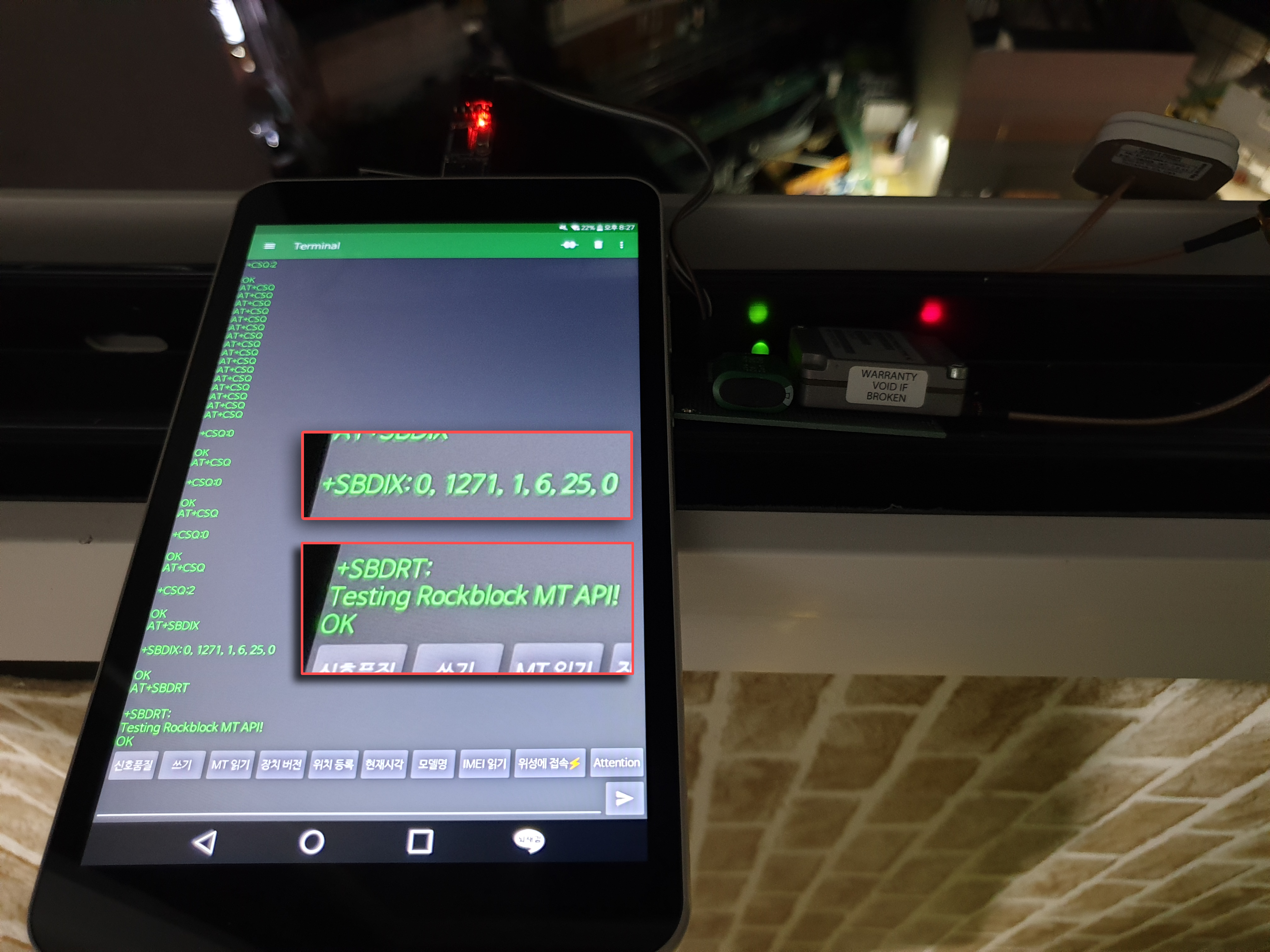 안테나를 내놓고 기다리니 잠잠하던 터미널 화면에 'SBDRING'이라는 문자열이 표시됐습니다.