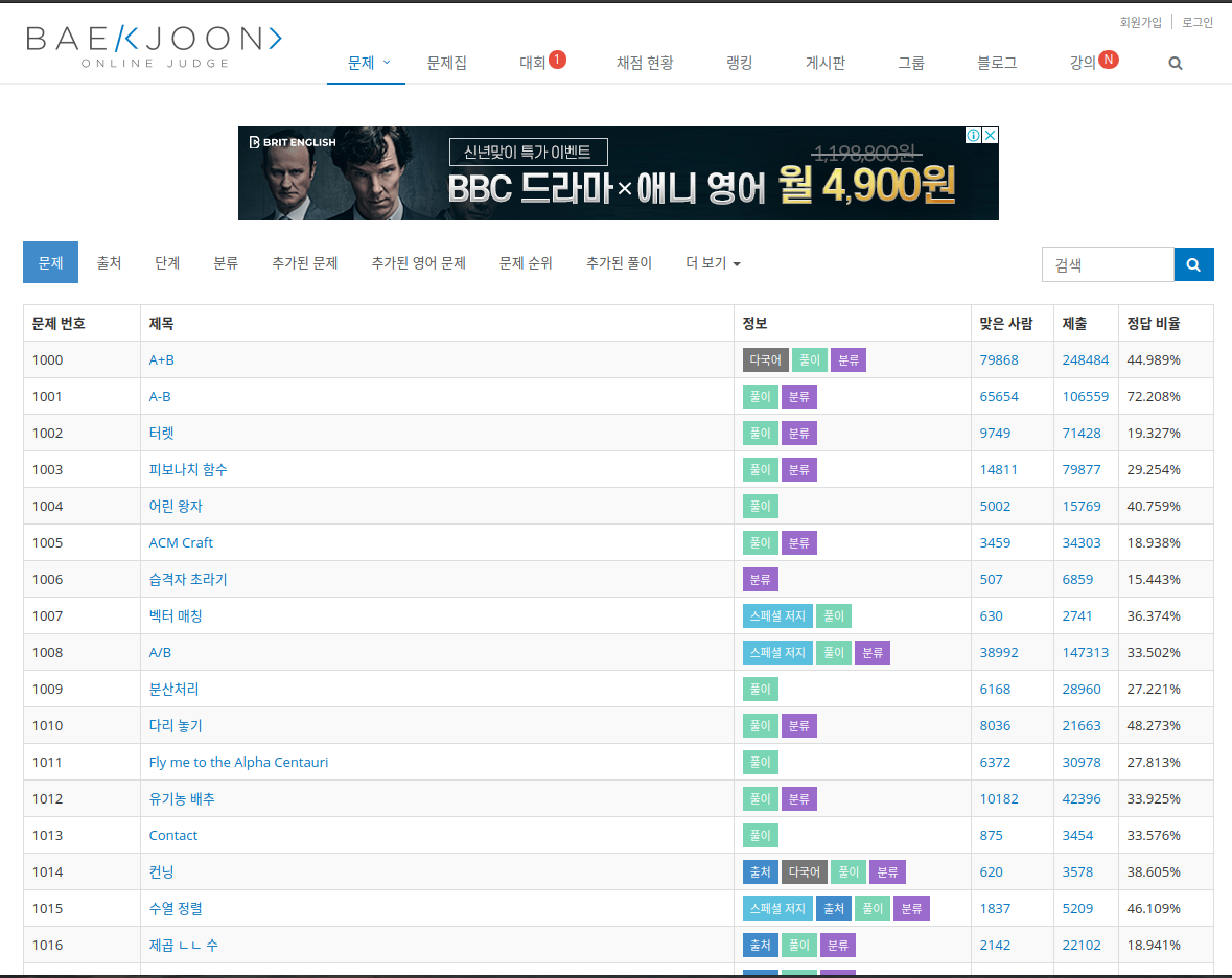 백준보다는 비교적 마이너한 감이 있고, 문제 수도 적은 편이긴 합니다.