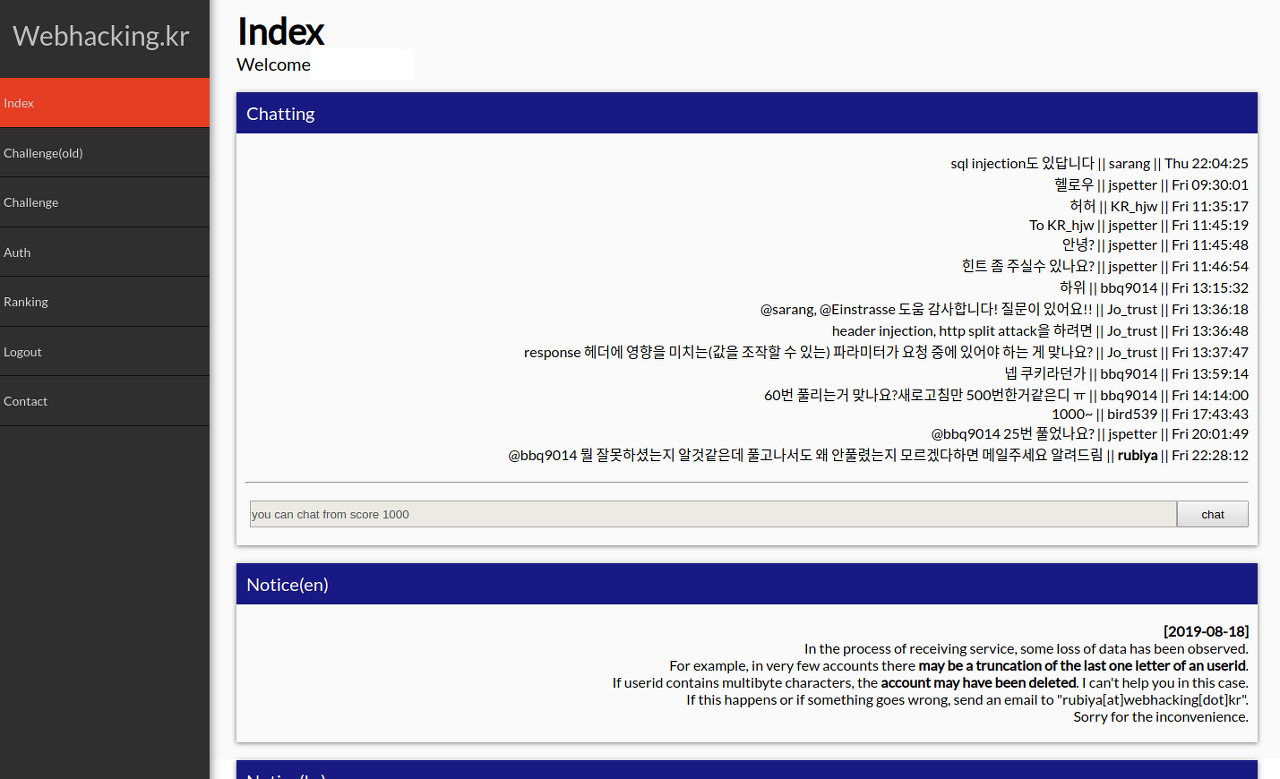 webhacking.kr은 주소에서 알 수 있듯 웹 해킹 문제를 풀어볼 수 있는 사이트입니다.