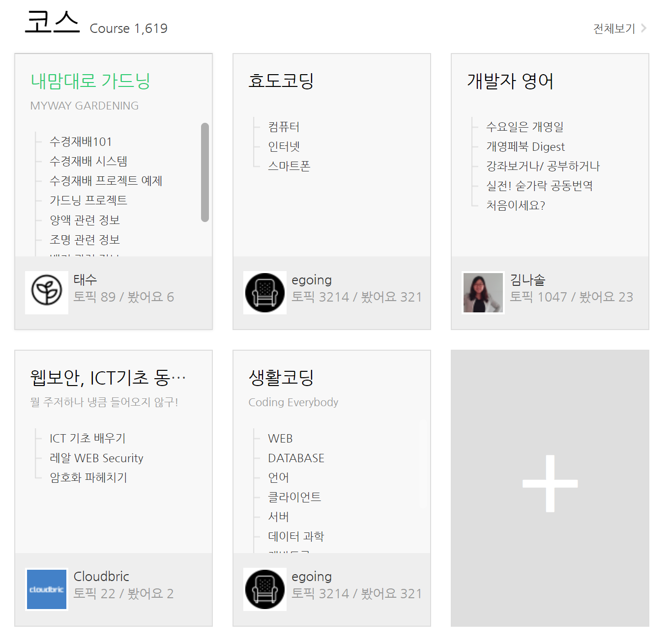 또한, 생활코딩 강의가 진행되는 opentutorials.org에서는 생활코딩 이외에도 다양하고 유익한 무료 강의가 진행되고 있으니 들어보시길 바라겠습니다.
