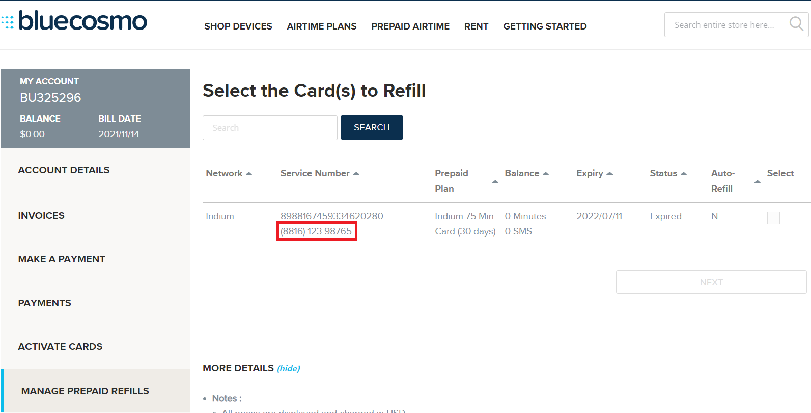 Bluecosmo 기준으로 홈페이지에 로그인 후 상단의 My Account에서 Manage Prepaid Refills 메뉴를 선택하면 자신이 등록한 SIM 카드 번호에 할당된 전화번호를 확인할 수 있습니다.