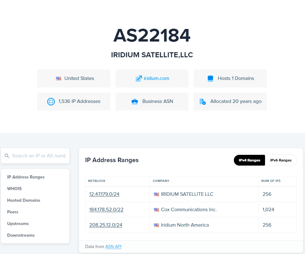 시도 결과, IP 주소는 12.47.179.48, ISP는 Iridium Satellite LLC로 잡혔고, AT&T망을 사용하는지 상위 업체명이 AT&T Services로 표시되고 있습니다.